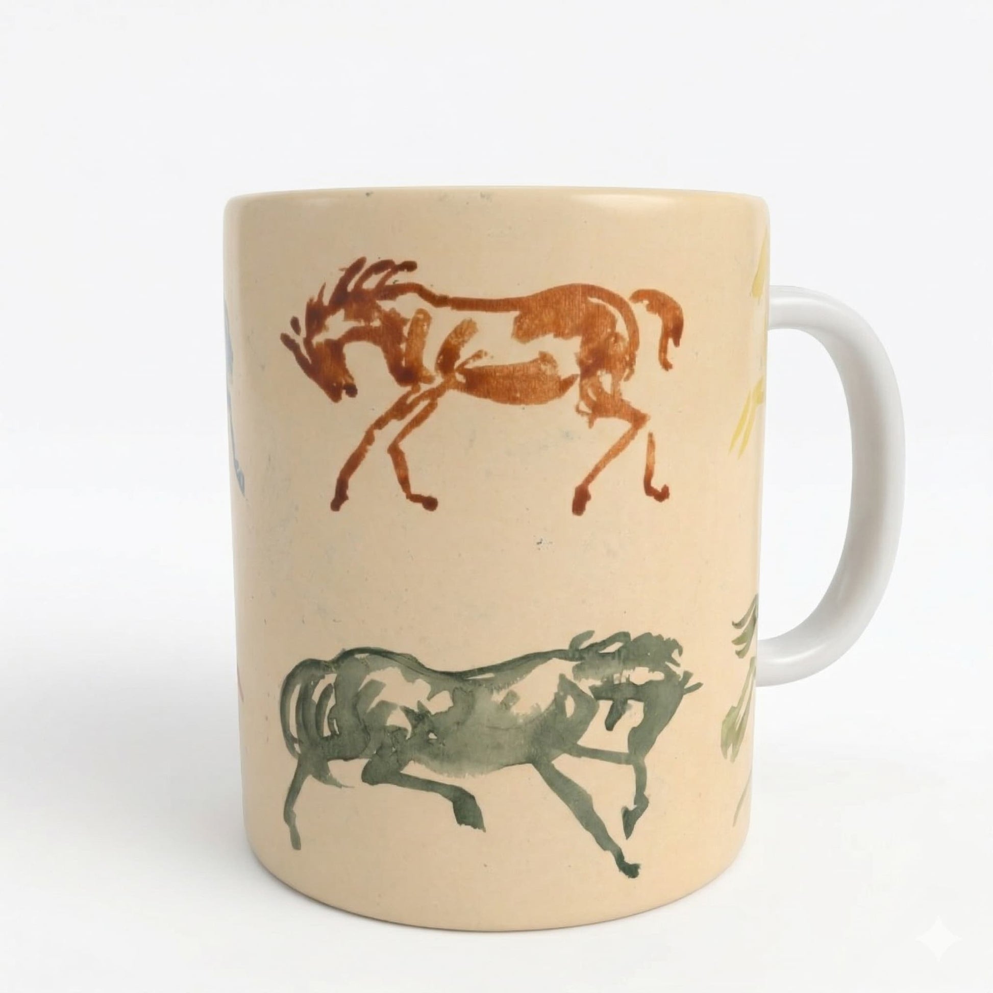 Known for his ability to capture the soul and movement of his subjects with minimal, emotive strokes, this wrap-around design showcases a series of horses in mid-stride. The earthy, watercolor-inspired tones of rust, moss, and ochre are set against a warm, cream-colored background, giving the mug a rustic, artisanal feel that looks as if it were plucked straight from an artist's studio.